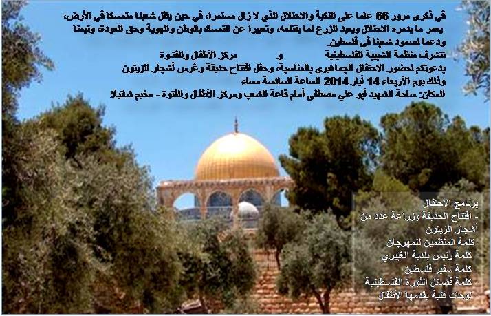 66 years has passed on the Nakba, since the Israeli occupation is continuing in Palestine and the Palestinian people is continuing the resist holding its territory, rebuilding what the occupation destroy, and replanting what the Israelis uproots.