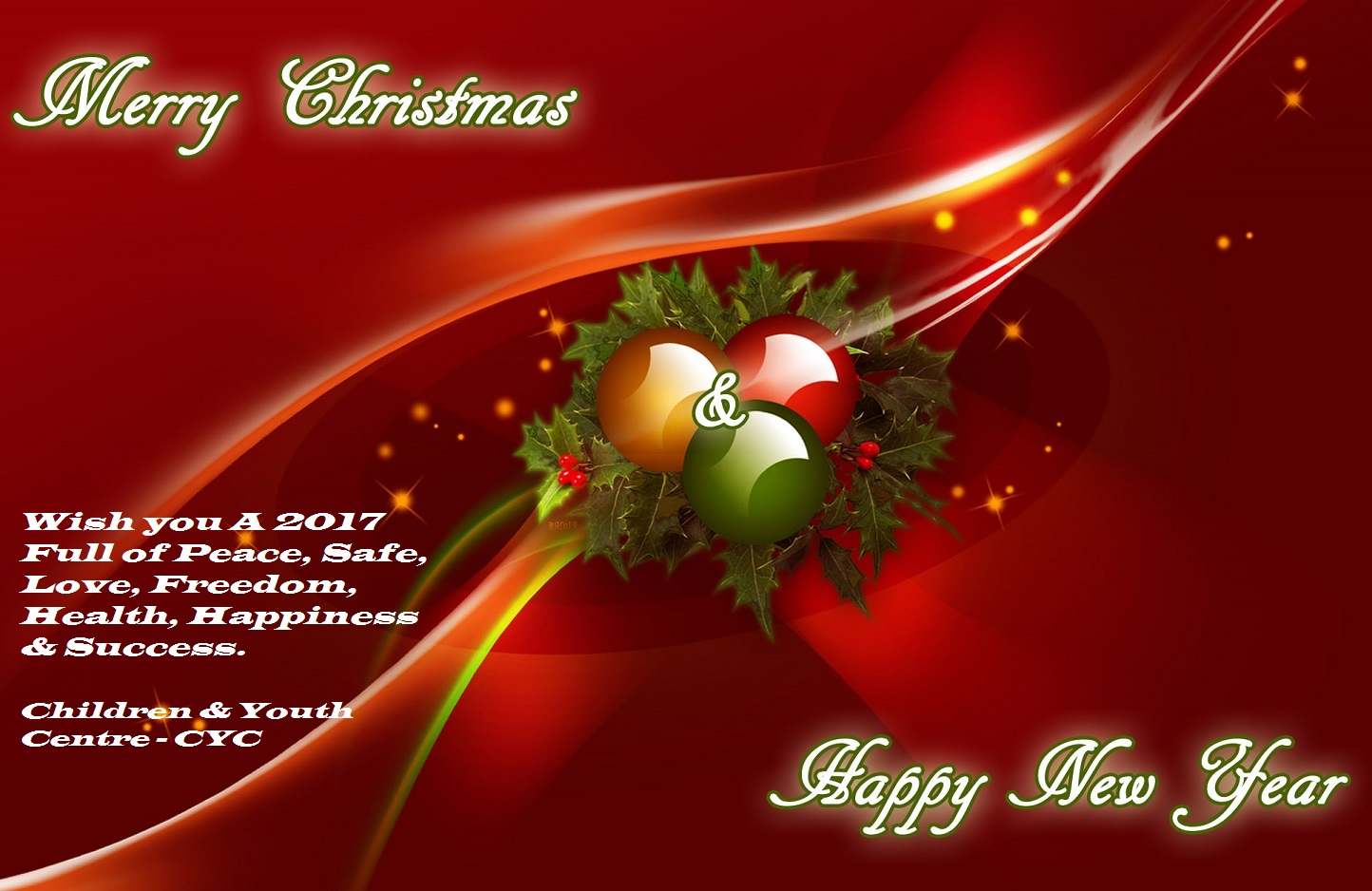 News Best Wishes of wonderful Season’s Holidays December 25, 2016 cycshatila Leave a comment Warmest Greetings Children & Youth Centre – CYC Share this: Click to print (Opens in new window) Print Click to email a link to a friend (Opens in new window) Email TweetLike Loading... Related